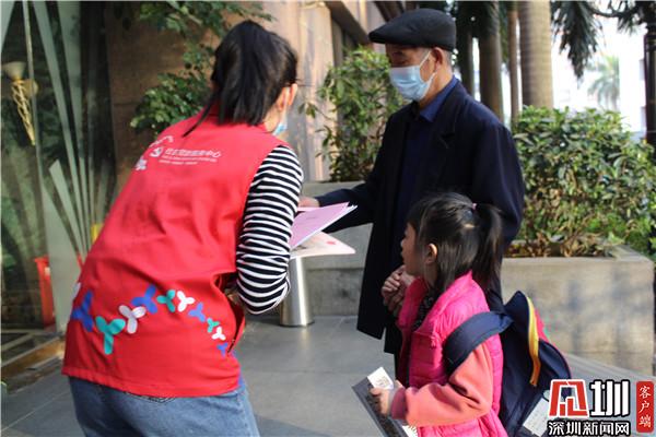 1月15日下午,深圳市羅湖區桂園街道老圍社區在轄區名仕閣小區開展2021年首場義工外展活動,義工與社工一起向過往行人發放《留深過年倡議書》,呼吁社區居民留在深圳,守望相助,共同抗疫。