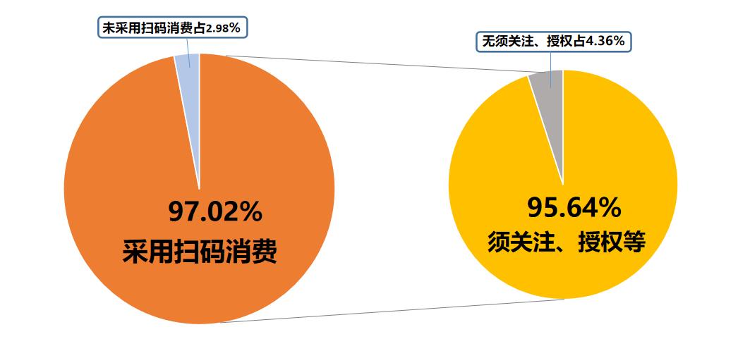 根據深圳市消委會初步調查,共走訪了36個大中型商超,26個連鎖餐飲品牌。統計數據顯示,有97.02%的商家采用了掃碼消費,其中95.64%的商家在掃碼后仍須關注或授權才可進行消費。