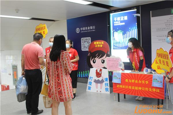 客運(yùn)繁忙的大劇院地鐵站就在老圍社區(qū),老圍社區(qū)黨委就把“疫苗接種宣傳先鋒崗”從小區(qū)卡口擴(kuò)展到地鐵口。在川流不息的地鐵口,宣傳崗上的大字“我為群眾辦實(shí)事,老圍社區(qū)疫苗接種宣傳先鋒崗”,金光閃閃格外醒目。旁邊的小喇叭循環(huán)播放:“接種疫苗人人有責(zé),打第二針疫苗請(qǐng)找我,不用排隊(duì)不用預(yù)約,專車接送。”