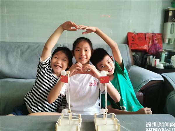 當天下午,20位回答了問題的小朋友得到了獎品,一個大大的工具包。他們要將工具包帶回家,自己動手,拼裝一個五星紅旗升降臺。吳燕柔姐弟三人第一個完成,他們一起在家中舉行升旗儀式。姐姐慢慢搖動升降臺的把手,三雙大眼睛盯著冉冉升起的五星紅旗,齊聲唱響了國歌。姐姐升完了弟弟再升,三人輪流一番,國歌也就一遍遍響起。意猶未盡之際,姐弟三人還比了一個大大的心,與自己親手制作的五星紅旗升降臺合影。