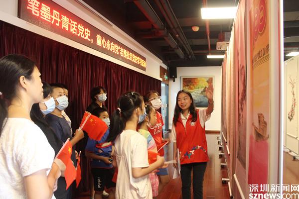 在10對親子家庭中,有跟媽媽一起來的,也有姐姐帶著弟弟妹妹來的;有二年級的小學(xué)生,也有剛上初三的中學(xué)生。無論大人還是孩子,都被一幅幅精彩的書畫作品吸引,“紅船”“井岡山”“延安”“紅軍長征經(jīng)過的雪山”……這些百年黨史中必不可少的故事,讓小朋友們睜大了雙眼、豎起了耳朵。他們盯著畫作,聽著社工的講解投入其中,現(xiàn)場氣氛熱烈。