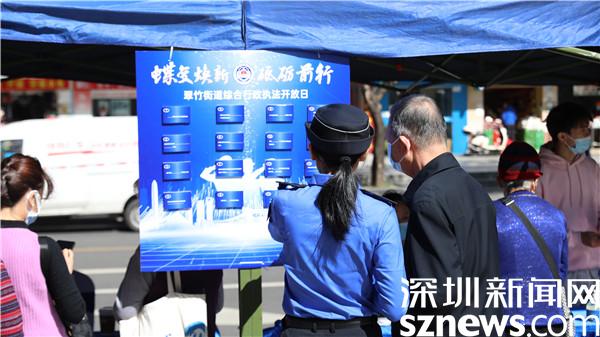 當天活動現場,翠竹街道辦事處副主任、綜合行政執法辦公室主任黎雄軒向市民展示街道一年來的執法工作成果及下一步的工作計劃,并呼吁市民朋友以主人翁的姿態積極參與街道城市管理工作,為打造干凈、整潔、有序、文明的城區環境貢獻自己的一份力量。