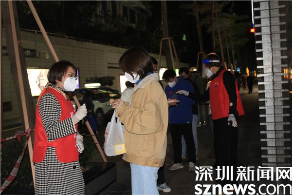 “楊妹,我來(lái)了,還帶來(lái)了一個(gè)人。”13日晚,正在羅湖區(qū)桂園街道老圍社區(qū)禧程酒店核酸檢測(cè)點(diǎn)忙碌的社工楊女士,接到志愿者溫寶珍的電話。溫寶珍從“0107疫情”開(kāi)始以來(lái),每天都在核酸檢測(cè)點(diǎn)協(xié)助核酸檢測(cè),這晚她把自己的兒媳婦吳永霞也帶來(lái)了。“婆婆剛從其他社區(qū)的核酸檢測(cè)點(diǎn)做完義工回來(lái),聽(tīng)說(shuō)老圍社區(qū)需要人,放下飯碗就來(lái)了。婆婆這么大年紀(jì)了還沖在前面,我做兒媳婦的,怎么也要向婆婆學(xué)習(xí)啊。”吳永霞對(duì)社工說(shuō)。“應(yīng)該的應(yīng)該的,疫情當(dāng)前,每個(gè)人都有義務(wù)出來(lái)與病毒作戰(zhàn),光是靠社區(qū)工作者不行,他們太累了。”溫寶珍邊說(shuō)邊幫兒媳穿好義工服,把粵核酸的二維碼交給兒媳,并教兒媳如何在手機(jī)上查驗(yàn)。