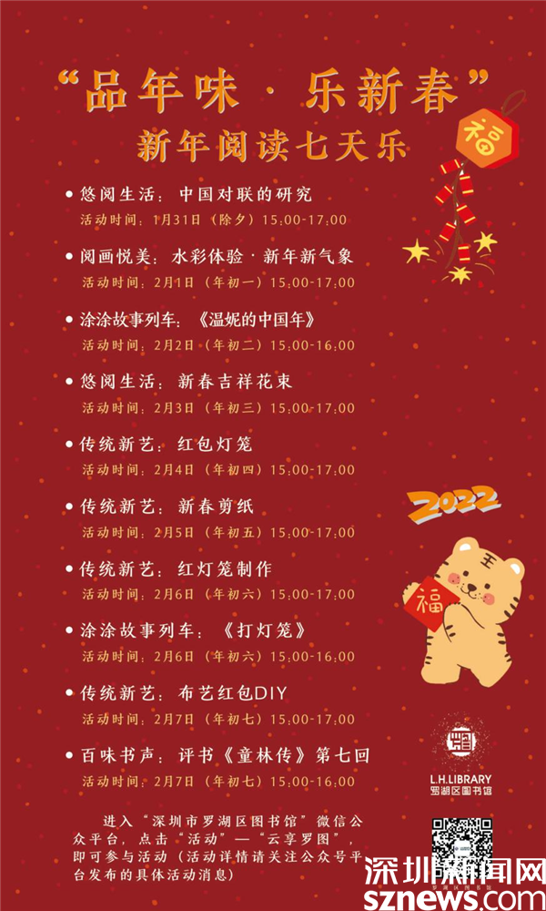 讀特客戶端·深圳新聞網2022年1月28日訊(記者 劉嘉敏 通訊員 張蕾)壬寅年春節將至,為了營造喜慶、歡樂、祥和的節日氛圍,羅湖區圖書館推出一系列豐富多彩的新春文化活動,讓留深讀者在新春佳節里盡享文化“大餐”。