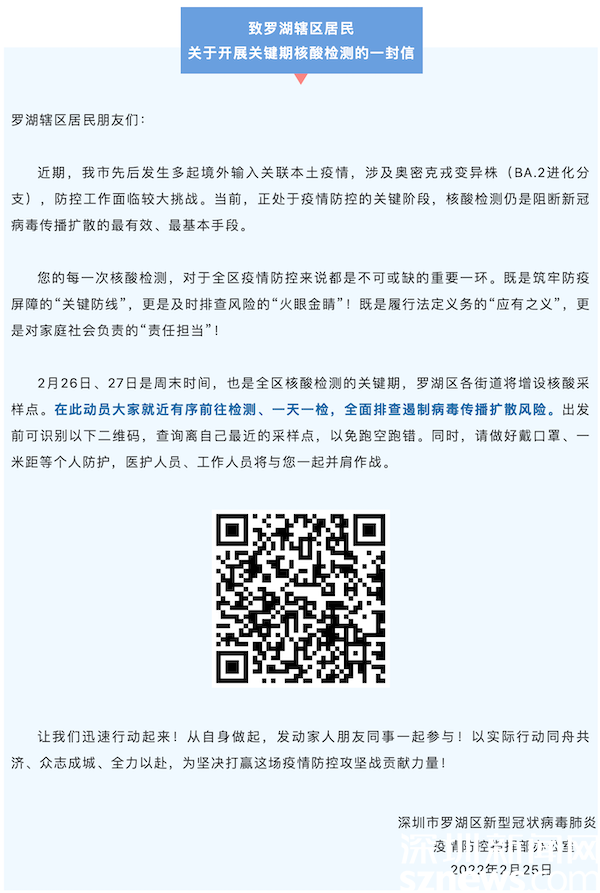 讀特客戶端·深圳新聞網2022年2月26日訊(記者 覃鈺清)2月25日晚,羅湖區新型冠狀病毒肺炎疫情防控指揮部辦公室發出《致羅湖轄區居民關于開展關鍵期核酸檢測的一封信》,該信函指出,本周末(2月26日、27日)是全區核酸檢測的關鍵期,全區各街道共設置200個核酸采樣點,動員轄區所有居民就近有序前往檢測、一天一檢,全面排查遏制病毒傳播擴散風險。26日上午,記者前往羅湖區桂園街道實地探訪核酸檢測開展情況。