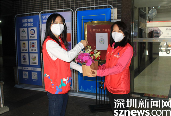 在老圍花園C2卡口,老圍社區(qū)黨委書(shū)記、婦聯(lián)主席許少瓊將花籃送到堅(jiān)守在這里的居民義工陳艷芳手中,感謝她對(duì)社區(qū)疫情防控的支持。一直以來(lái),陳艷芳只要有空就到社區(qū)做義工,核酸檢測(cè)點(diǎn)、小區(qū)卡口都是她的戰(zhàn)場(chǎng),查驗(yàn)綠碼、場(chǎng)所碼、督促戴口罩,測(cè)體溫,早已游刃有余,是名副其實(shí)的抗疫女戰(zhàn)士。她接過(guò)花籃,對(duì)許少瓊說(shuō),“其實(shí)社區(qū)工作人員更辛苦。”