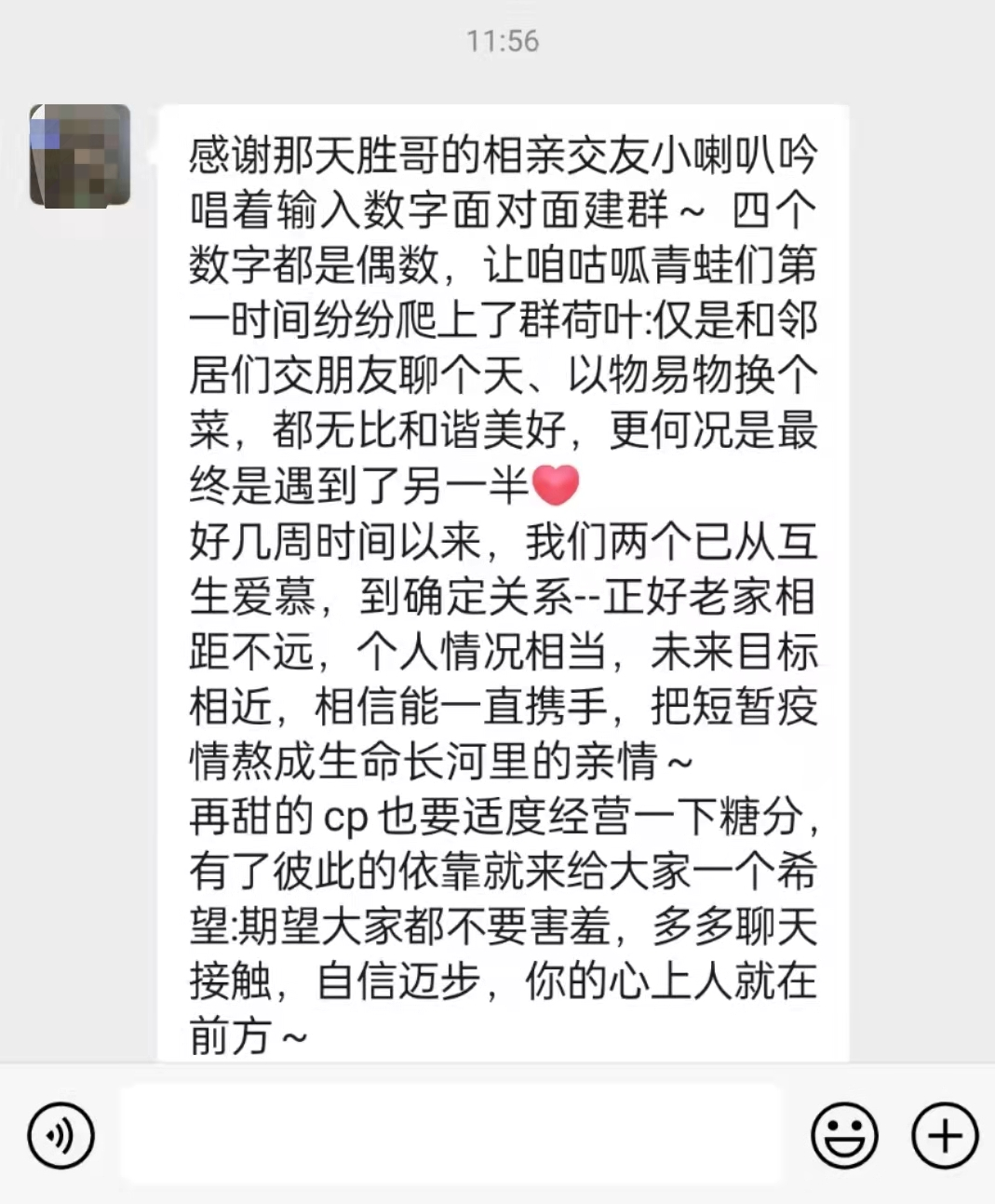 一開始單身交友群只有一個,慢慢地周邊社區越來越多人加入,群聊數量增加到了十個。由于群信息互不相通,王勝在每天做完工作后,轉發各單身青年的個人介紹、照片以及擇偶標準到十個群里,有時發成語接龍的小游戲活躍氣氛。“群里的單身青年們非常積極,大家都喜歡這種模式。我沒事的時候也經常和他們聊聊天,讓大家隔離期間。”王勝說。