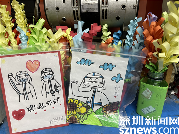 羅湖區蓮塘小學某班班長見醫護人員和義工志愿者日夜操勞,不辭辛苦,號召全班同學為防疫人員“送溫暖”。有的同學親手制作五顏六色的精美手折紙花,還有些同學別出心裁的繪制了“感謝大白”賀卡,禮物制作完成后,全班同學分頭行動,將手折紙花送到各核酸采樣點醫護人員和志愿者手中。“我們幫不上什么,做些力所能及的事情,為大哥哥大姐姐送去感動和力量,也是為抗疫做貢獻。”來自羅湖中醫院,在蓮塘村七巷小廣場支援的醫護人員們收到同學們送來的“禮物”非常開心,紛紛表示,雖然每天工作很辛苦,但能得到群眾尤其是孩子們的肯定十分幸福,禮物雖小,卻無比溫暖和感動。