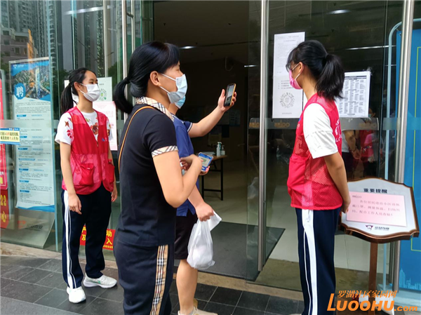 最先上陣的是一對父女兵:蔡玉堂和女兒蔡潤怡,他們利用周末時間在老圍花園E棟單元門值守。這是兩棟高層住宅,兩個單元的人都從這個門進出。只見父女倆一個指引進入的居民掃場所碼,一個提示測體溫、驗碼,倆人分工負責,配合默契。他們都是老圍社區蔡屋圍村的居民,對自己的家園有著特殊的情感。今年12的蔡潤怡更是在這里出生長大,許多樓上樓下的鄰居都認識她,看她做義工,都親熱地跟她打招呼,并主動配合查驗。雖然出入人員較多,但有了父女倆的值守,卡口井然有序。