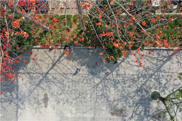赤焰灼灼的木棉花開了,染紅了轄區(qū)半邊天際,與深圳藍相映成趣。一朵朵嫣紅的花兒垂?jié)M枝頭,沐浴著暖春的陽光綻放,也點綴著樹下賞花的居民們。