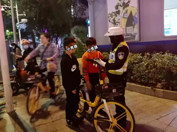 2月1日晚,羅湖交警大隊東門中隊警輔隊員曾惠珍執勤時發現兩名10歲左右的小男孩在主干道深南大道上嬉笑打鬧,一名男孩騎行共享單車,另一名男孩跟在自行車后面跑動,全然不顧路上疾馳的車輛。