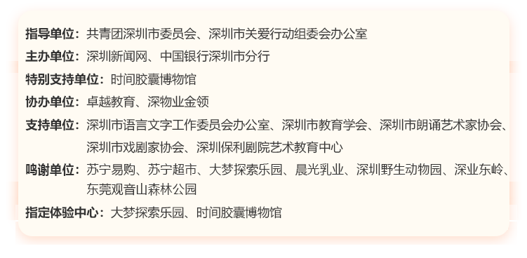 讓閱讀成為動人的風景,讓故事的魅力感動深圳。為助力建設良好的青少年閱讀環境,激發學生閱讀興趣,倡導親子閱讀,共建和諧家庭關系。2020年,第二十一屆深圳讀書月主題活動“誰是故事大王·第四季”在共青團深圳市委員會、深圳市關愛行動組委會辦公室的指導下再出發。更長的活動周期,更豐富的參與形式,更專業的賽制,“誰是故事大王·第四季”等你來解鎖與挑戰!