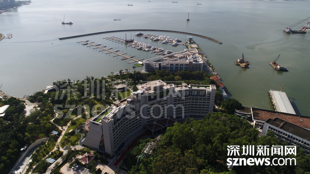在酒店臨海客房陽臺可看到深圳灣大橋以及附近的游艇碼頭