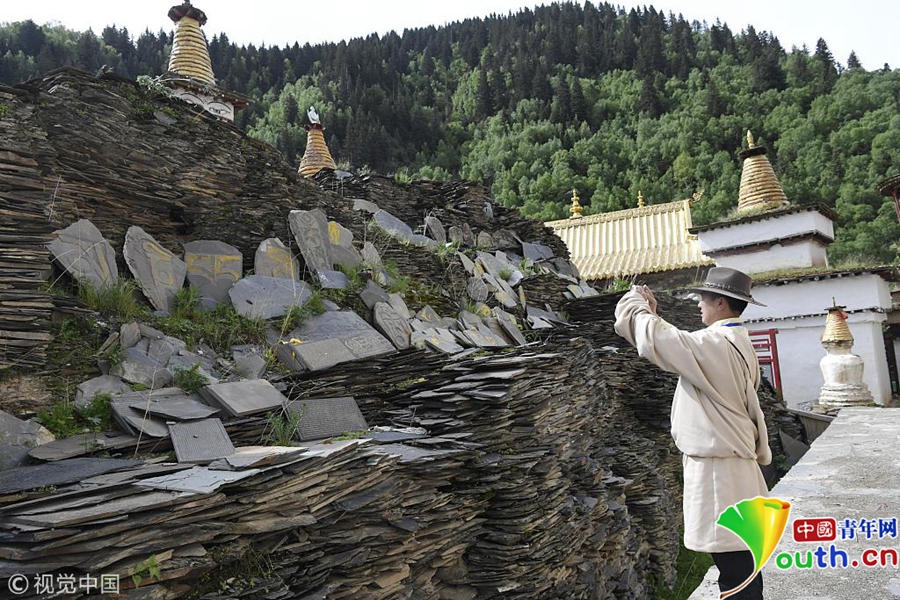 在四川阿壩州壤塘縣棒托寺內珍藏約50萬片明清時期鐫刻的大藏經《甘珠爾》和《丹珠爾》,大藏經左高9.7米,右高9.2米,長46米、左寬160米,右寬13米,占地598平方米,是目前全世界保存最完整、規模最宏大、內容最豐富的石刻大藏經孤品。據史料記載,由明末清初60余名石匠辛勤鐫刻9年而成。石刻藏文經書圖文并茂,筆法流暢,疏密有致,陰陽相背,滿版生輝。具有極高的文物和藝術研究價值。圖為堆積的石刻大藏經孤品。圖片作者/視覺中國