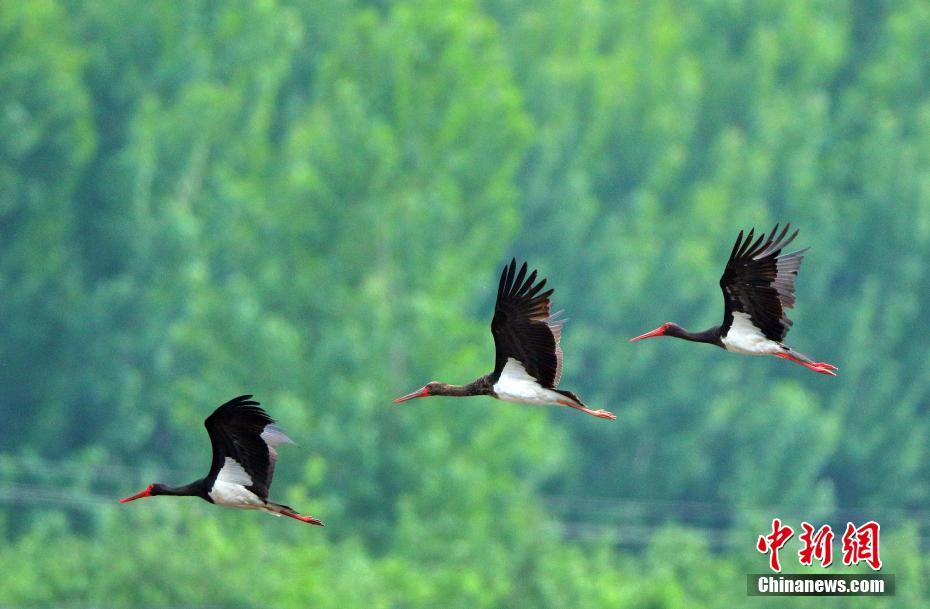 7月1日,河北石家莊平山崗南水庫下游滹沱河段發現成群黑鸛,最多時達12只,黑鸛是大型涉禽,屬國家一級保護動物,也是世界瀕危珍禽,已被《瀕危野生動植物國際貿易公約》列為瀕危物種。中新社發于英杰 攝
