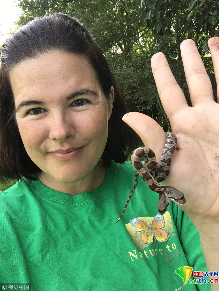 野生動物專家Tanee Janusz收養了同事在后院發現的一只雙頭錦蛇。圖片來源:視覺中國