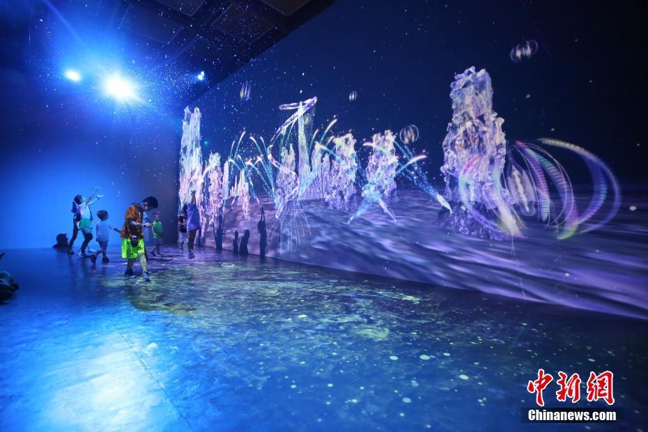 7月5日,民眾欣賞“尋夢海底兩萬里深海之光”沉浸式藝術展。當日,該展在北京嘉德藝術中心開幕。展覽是以“深海之光”為主題的海底光影沉浸式藝術展,創意藝術團隊利用數字技術和水打造出一個能夠感受到“生命”的深海世界。中新社記者楊可佳 攝