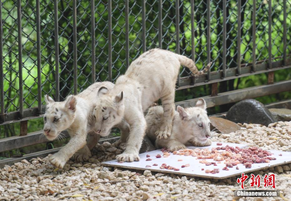 7月10日,雪虎五胞胎分享“肉餡蛋糕”。當(dāng)日,濟(jì)南野生動(dòng)物世界五胞胎雪虎誕生滿百日,正式與游客見(jiàn)面。中新社記者 張勇攝