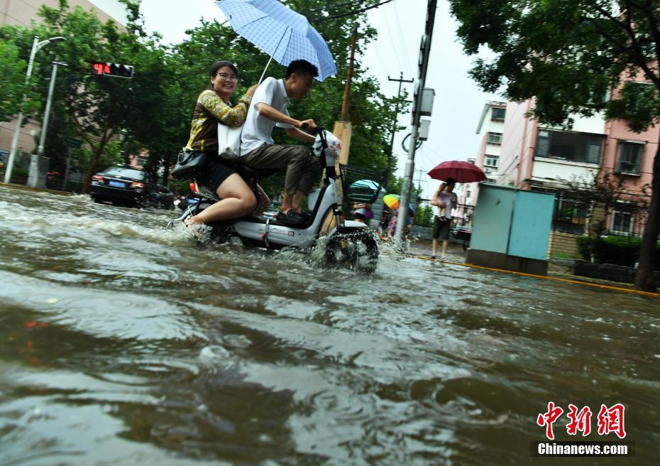 7月16日下午,河北石家莊一條馬路積水嚴重,民眾涉水騎行。當日,該省氣象臺發布暴雨藍色預警,承德、雄安新區、廊坊北部、石家莊中西部、邢臺西部等多地遭受暴雨襲擊。中新社記者翟羽佳 攝