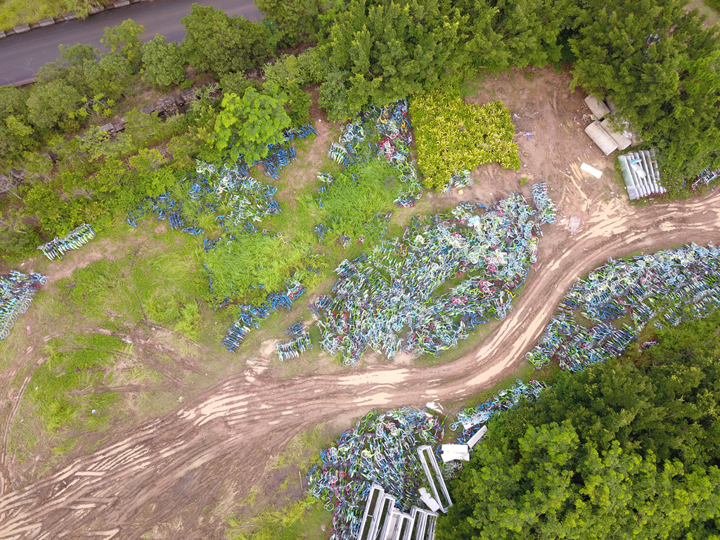 從高空俯瞰,安托山山頂?shù)墓蚕韱诬嚩逊e無(wú)序、且周圍雜草叢生,猶如一片共享單車“墳場(chǎng)”