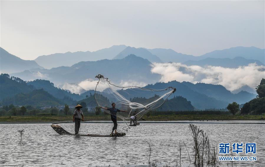 8月1日,淳安縣汾口鎮紅星村的漁民乘著竹排,在千島湖的支流武強溪上進行撒網捕撈作業。新華社記者 徐昱 攝