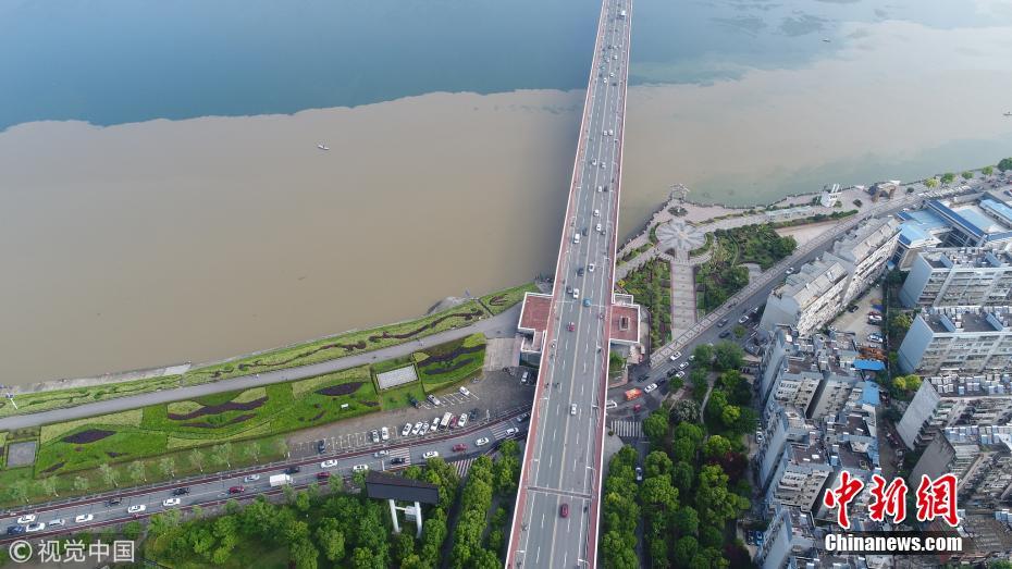 5月7日,湖北省襄陽市,無人機航拍的漢江長虹大橋處涇渭分明的漢江水面。強暴雨沖刷經過去冬今春的田野地表積累的塵土,經支流與主河道匯入時,充滿污泥的洪水與主河道上清澈的丹江水形成難得一見的涇渭分明景觀。王虎攝 圖片來源:視覺中國