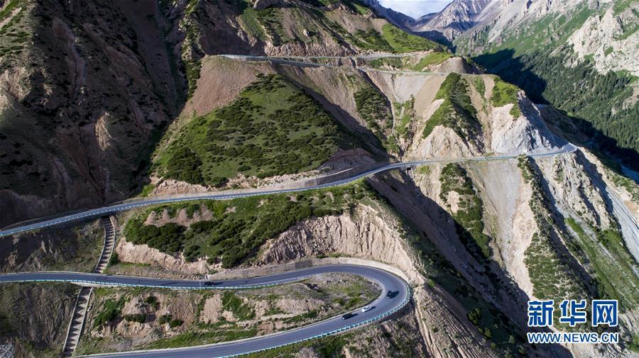 連續轉彎的獨庫公路盤山道(2017年7月15日無人機拍攝)。 新華社記者 江文耀 攝