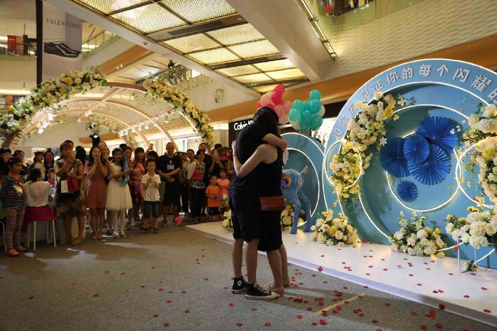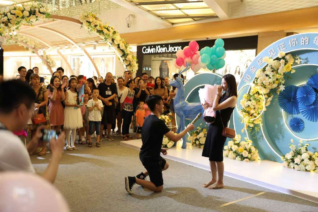 開(kāi)幕式當(dāng)天,潤(rùn)金店工作人員還配合市民楊先生上演了一場(chǎng)浪漫的“求婚大作戰(zhàn)”。原來(lái),數(shù)日前,楊先生到潤(rùn)金店表示要買(mǎi)一枚與眾不同的戒指向女友求婚。在銷售顧問(wèn)的建議下,楊先生選購(gòu)了一枚藍(lán)寶石戒指作為求婚信物。得知楊先生的心意后,潤(rùn)金店品牌策劃部決定與楊先一起在七夕當(dāng)天完成這場(chǎng)浪漫的“求婚大作戰(zhàn)”。當(dāng)天,楊先生帶著毫不知情的女友來(lái)到潤(rùn)金店“炫出色彩 耀你不凡”VIP品鑒會(huì)現(xiàn)場(chǎng)。正當(dāng)女友全神貫注欣賞小提琴、拉丁舞等開(kāi)幕式表演節(jié)目時(shí),楊先生從兜里掏出事先準(zhǔn)備好的藍(lán)寶石戒指,單膝跪地向一臉茫然的女友喊:“嫁給我吧。”此時(shí),開(kāi)幕式現(xiàn)場(chǎng)背景音樂(lè)“配合”地?fù)Q成了甜蜜的《今天你要嫁給我》。感動(dòng)得熱淚盈眶的女友在圍觀市民的歡呼中,拉起了楊先生,并答應(yīng)了他的求婚。圍觀市民表示“七夕不過(guò)是路過(guò),卻不料狠狠地吃了一把狗糧。”