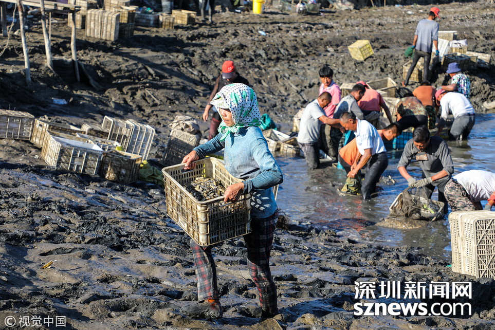 深圳新聞網訊  2018年9月8日,遼寧丹東,早上5點,挖蟶人紛紛下到各個池子,要在海水海泥里艱辛勞作10小時,直至下午3點集體上岸,等待買家的運輸車隊運走他們的勞動成果。9月初,遼寧沿海養殖區進入養殖海鮮的收獲季。在東港,常常出現數百人乃至上千人集結在池子里挖蟶子(這里特指縊蟶,即東港當地人所說的小人仙。下同)的壯觀景象。在養殖海鮮的收獲季,成群的海鷗趁機“助陣“,人與大自然和諧共處的畫面令人嘆為觀止。