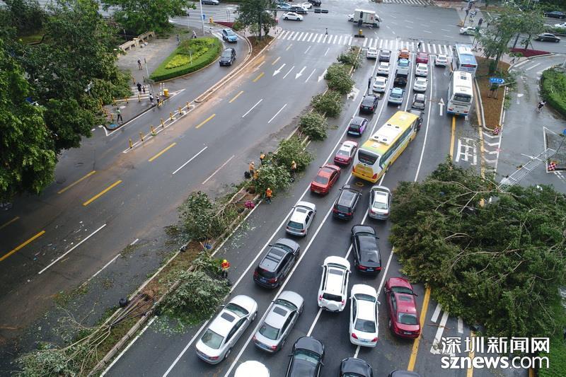 蓮花路新洲路口,有工作人員正在清理道路中伏倒的樹木