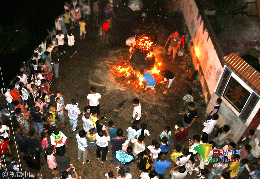 江西省進賢縣西湖李村燒圣塔喜迎中秋節。燒圣塔是當地從古至今延續下來的中秋習俗。