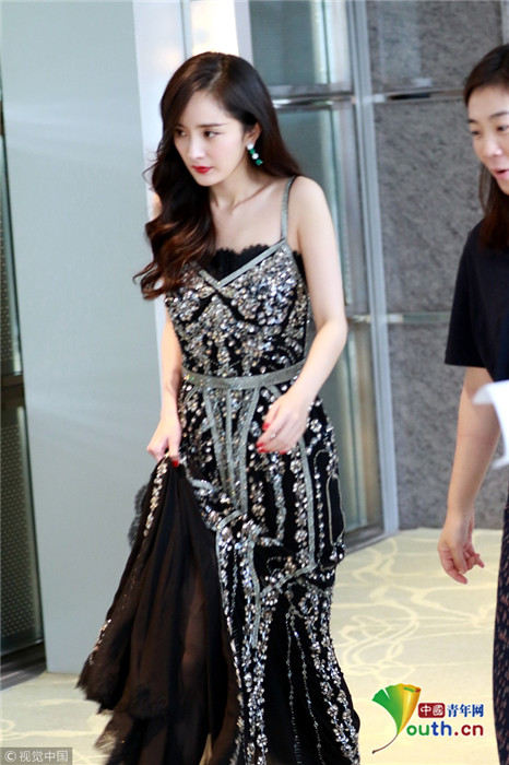 楊冪卷發成熟美露香肩 自提裙擺過酒店大堂