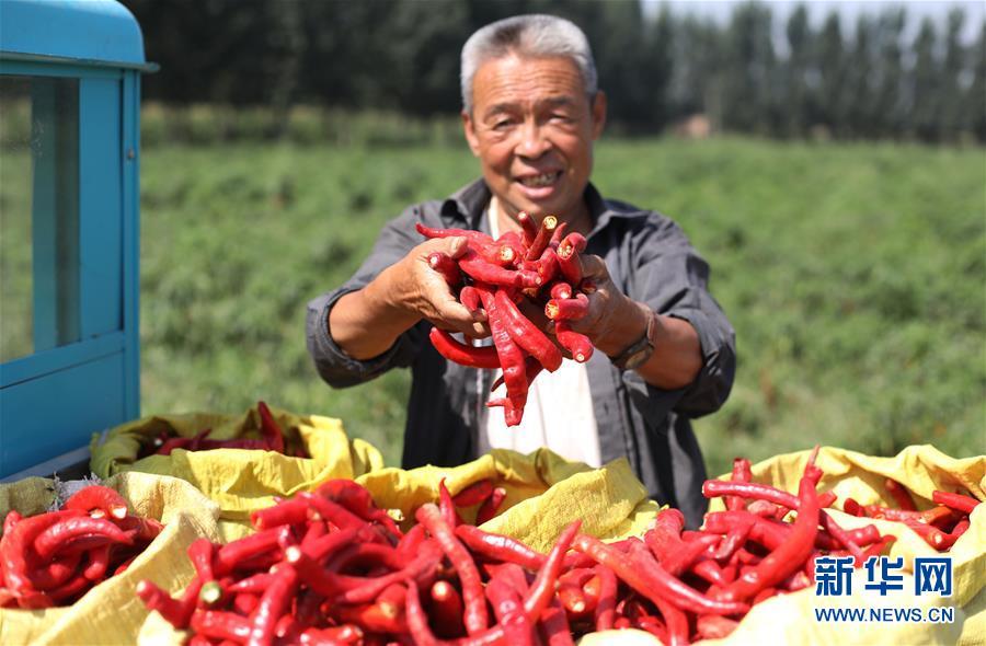9月16日,阜城縣王集鄉南張莊村農民在展示采摘的辣椒。近年來,河北省阜城縣王集鄉在推進產業富民過程中,積極引導農民調整農業產業結構,按照品種特色化、種植規模化、產銷一體化的“公司+基地+農戶”的經營模式,鼓勵農民發展特色辣椒種植,推行“訂單種植”模式,開辟出了一條農民創收新路徑。目前,阜城縣王集鄉辣椒種植面積3100余畝,每畝年收益2500元以上,帶動當地農民實現增收。新華社記者朱旭東攝