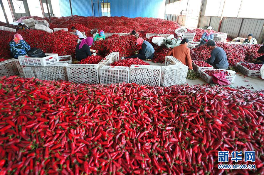 9月19日,在吉林省白城市通榆縣,農民在分揀收獲的辣椒。 新華社記者 張楠 攝