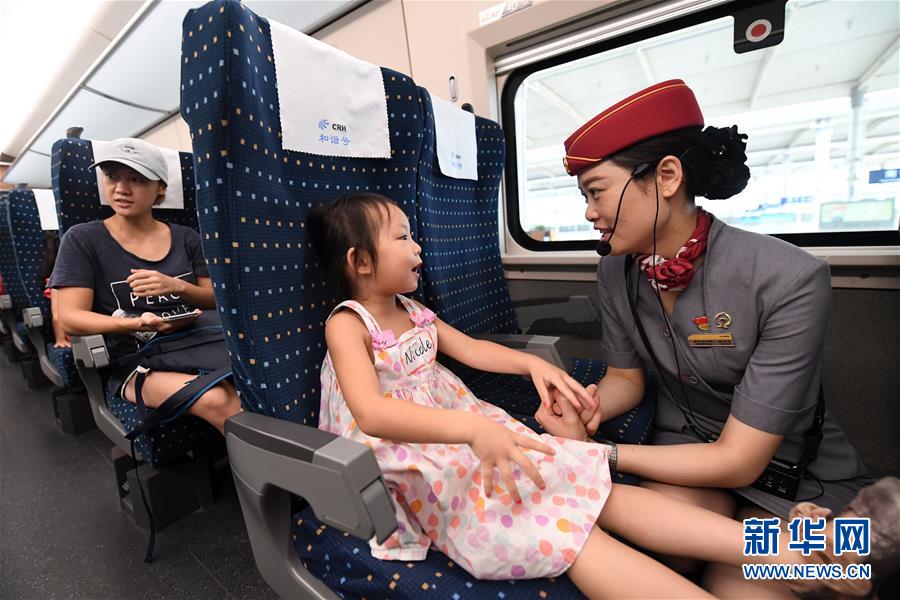 在南寧東站,一名列車工作人員在和一名小朋友交流(2017年8月5日攝)。 廣西壯族自治區成立60年來,鐵路建設發生翻天覆地的變化。來自中國鐵路南寧局集團有限公司的數據顯示,1958年廣西鐵路總里程為1346.3公里,如今廣西鐵路總里程達5191公里。廣西與周邊相鄰省份間實現動車“公交化”開行。此外,北部灣港—重慶班列、東盟海產品冷鏈班列、“百色一號”果蔬專列等的開通和運營,強化了鐵路供給的針對性和有效性。鐵路成為助推廣西經濟社會快速發展的“大動脈”。 新華社記者陸波岸攝