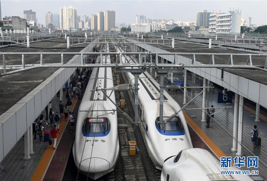 在廣西南寧站,旅客進入站臺準備乘坐動車出行(9月4日攝)。 廣西壯族自治區成立60年來,鐵路建設發生翻天覆地的變化。來自中國鐵路南寧局集團有限公司的數據顯示,1958年廣西鐵路總里程為1346.3公里,如今廣西鐵路總里程達5191公里。廣西與周邊相鄰省份間實現動車“公交化”開行。此外,北部灣港—重慶班列、東盟海產品冷鏈班列、“百色一號”果蔬專列等的開通和運營,強化了鐵路供給的針對性和有效性。鐵路成為助推廣西經濟社會快速發展的“大動脈”。 新華社記者陸波岸攝