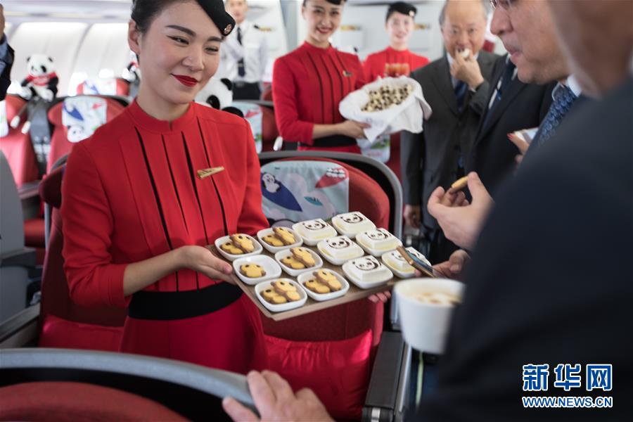 9月26日,在以色列特拉維夫本·古里安國際機(jī)場,四川航空公司空乘人員在機(jī)上展示熊貓主題的小吃。 新華社記者郭昱攝