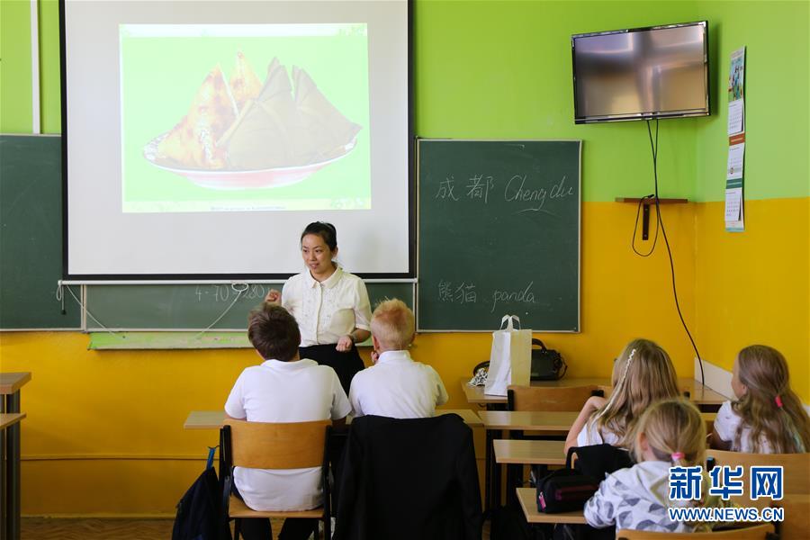 9月25日,在波蘭羅茲第一小學,成都青白江區外國語小學老師李艷向波蘭小學生介紹中國美食。成都青白江區外國語小學與波蘭羅茲第一小學25日在波蘭中部城市羅茲簽署友好學校合作協議。這是繼成都與羅茲2015年結為友城之后,兩座城市人文交流合作的又一新成果。2013年,東起成都青白江、西至羅茲的中歐班列(蓉歐快鐵)開通。5年來,來往兩地的班列不斷增加,有力促進了成都與羅茲在經貿、教育、文化等多領域的交流與合作。新華社記者 陳序 攝