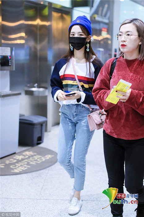2018年9月25日,北京,“錦鯉少女”楊超越現身機場,她身穿“彩虹裝”青春無敵,戴著糖果色耳環,細節處可愛吸睛。