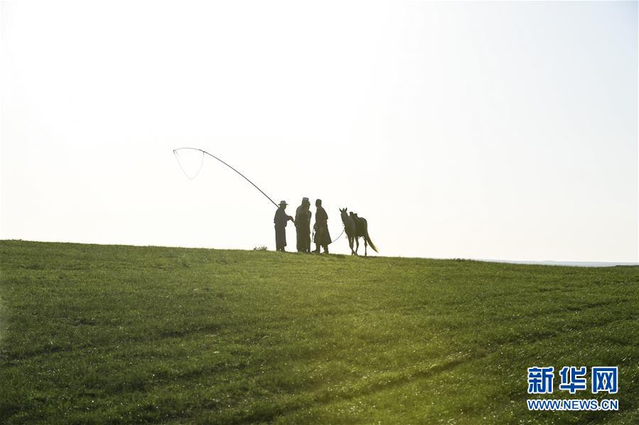 西烏珠穆沁旗草原上的牧民(7月21日攝)。盛夏時節,內蒙古錫林郭勒草原一碧千里,遙接天際。藍天白云之下,牛羊悠閑自在,馬群奔馳其中,風光旖旎。 新華社記者 劉磊 攝
