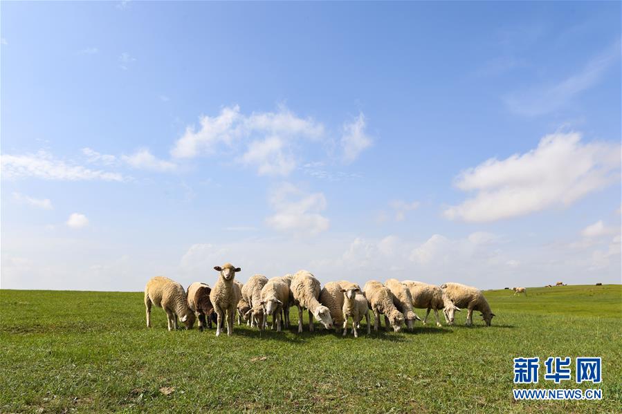 羊群在錫林郭勒盟正藍旗的草原上覓食(7月16日攝)。盛夏時節,內蒙古錫林郭勒草原一碧千里,遙接天際。藍天白云之下,牛羊悠閑自在,馬群奔馳其中,風光旖旎。 新華社記者 劉磊 攝