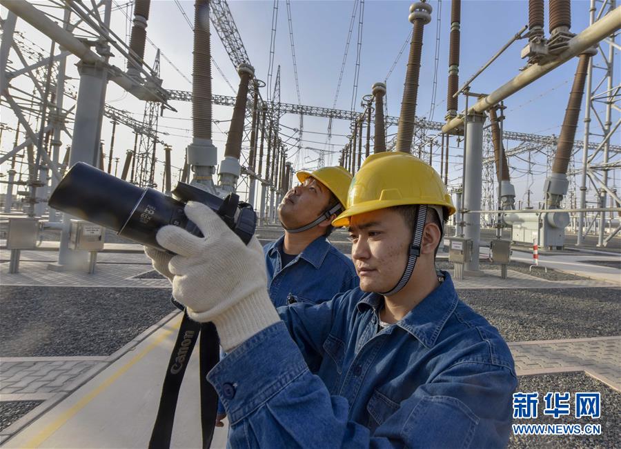在吐魯番市750千伏變電站,兩位工作人員利用專用設備對電力設施進行檢查(9月18日攝)。新華社記者趙戈 攝