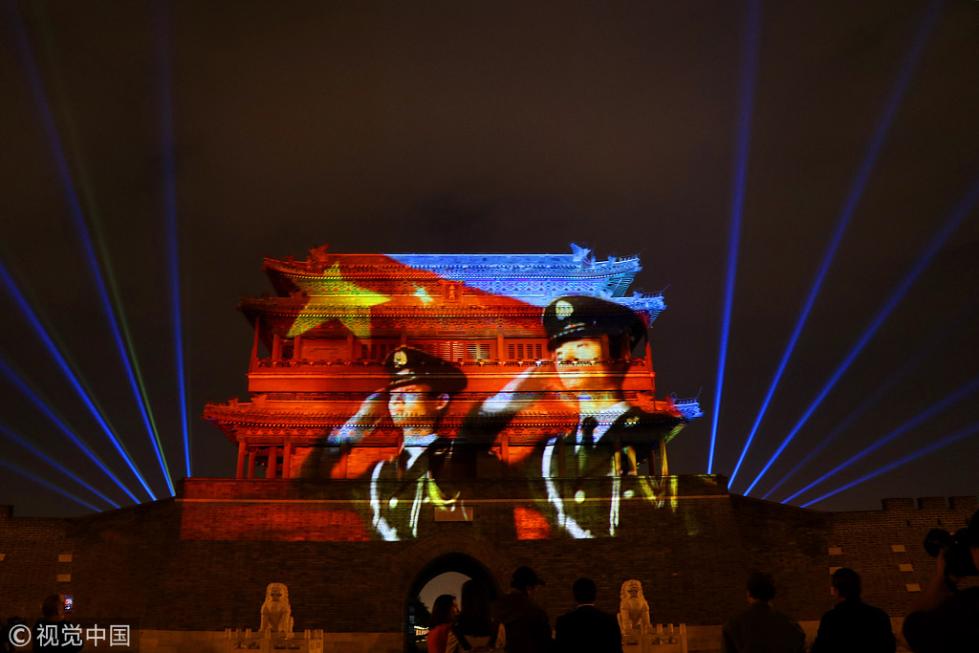 永定門城樓南廣場舉辦的“我愛你中國”迎國慶燈光秀于2018年9月28日晚正式向市民首秀。即日起至10月7日,每晚這里都將啟動燈光表演。