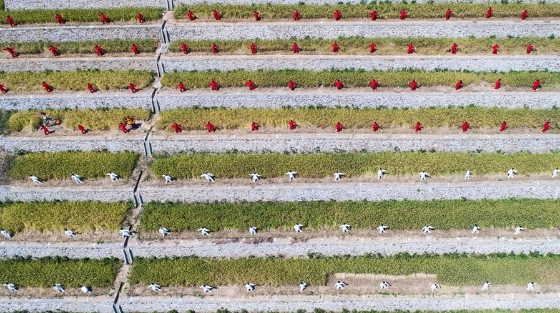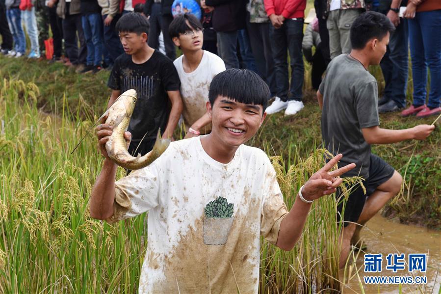 9月29日,一名小伙子展示摸到的魚。9月29日,云南省尋甸回族彝族自治縣2018年首屆農民豐收節暨第二屆摸魚節在雞街鎮舉行,當地農民和游客在豐收的稻田里進行摸魚、拔谷穗、山歌對唱等活動,享受收獲的喜悅。新華社記者楊宗友攝