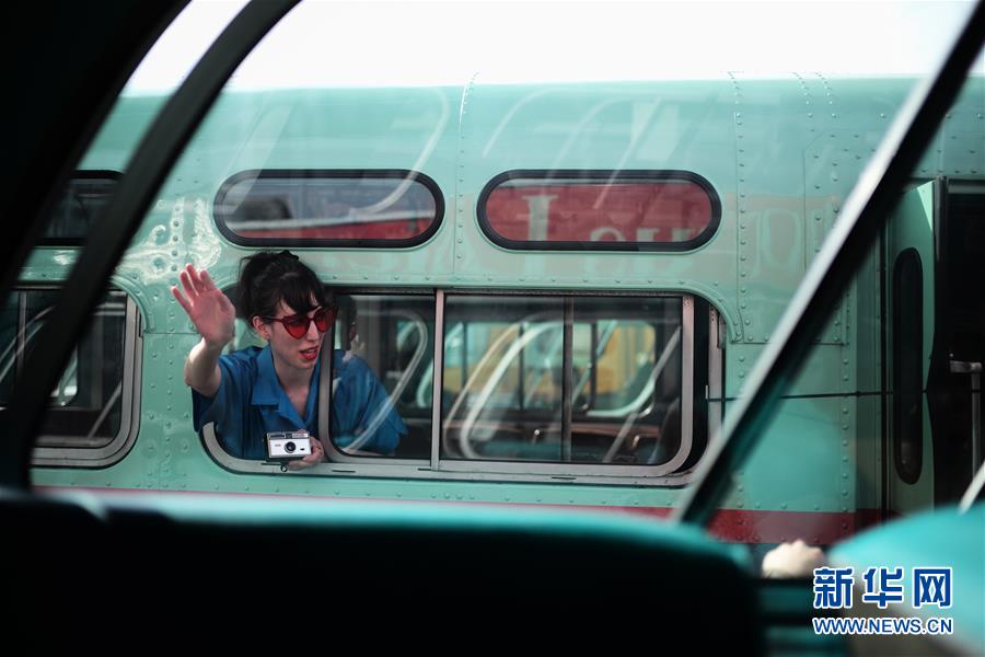 10月7日,在美國紐約舉行的巴士節上,一名女子在一輛老巴士上拍照。 新華社記者李木子攝