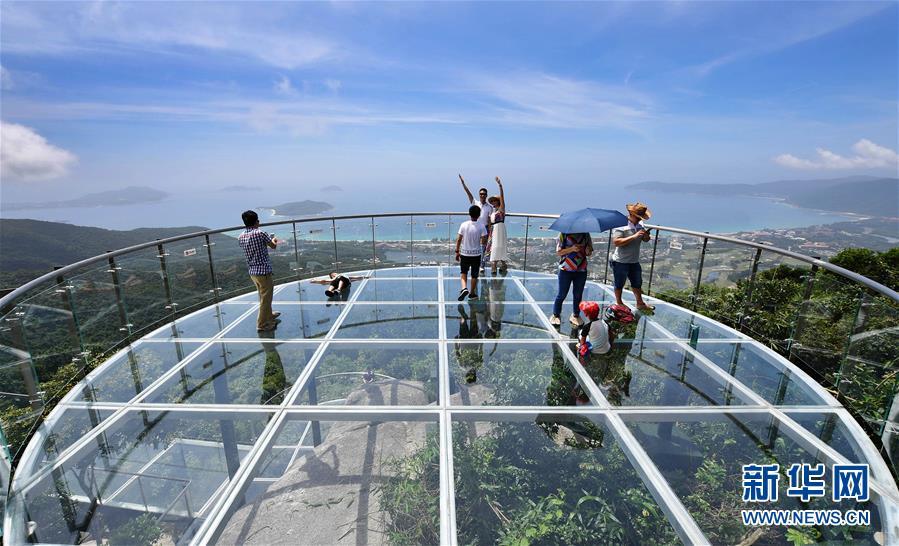 8月31日,游客在玻璃觀景平臺(tái)上參觀游覽。近日,位于海南省三亞市亞龍灣熱帶天堂森林公園的大佛石全海景玻璃棧道開始正式營(yíng)業(yè)。凌空而建的玻璃棧道全長(zhǎng)400米,游客可將亞龍灣的美景盡收眼底。新華社記者郭程攝