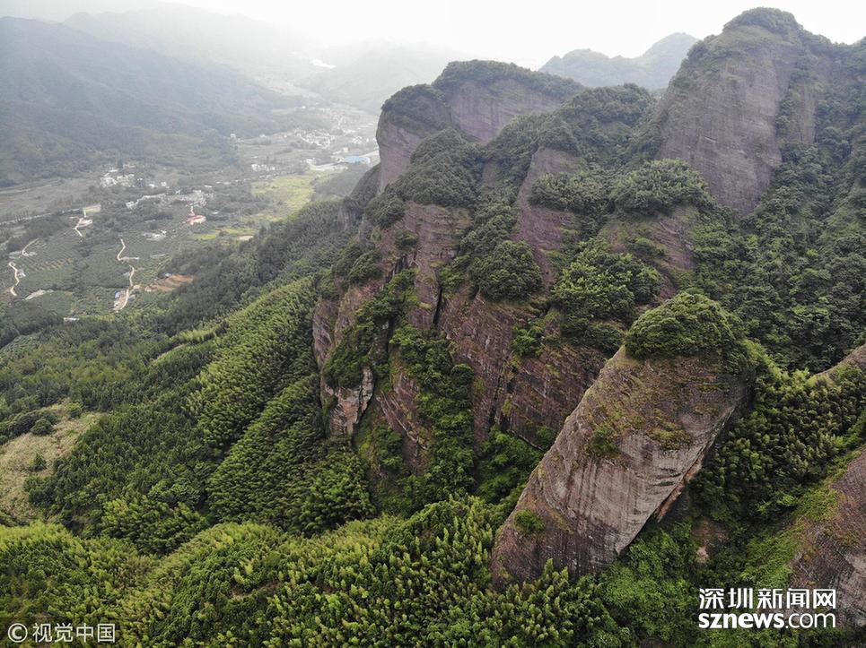 航拍位于贛粵兩省交界處的江西南武當山。 南武當山擁有99座千姿百態的巍峨石峰,丹霞地質風貌突出,連綿十里,被稱為“武當十里畫廊”。