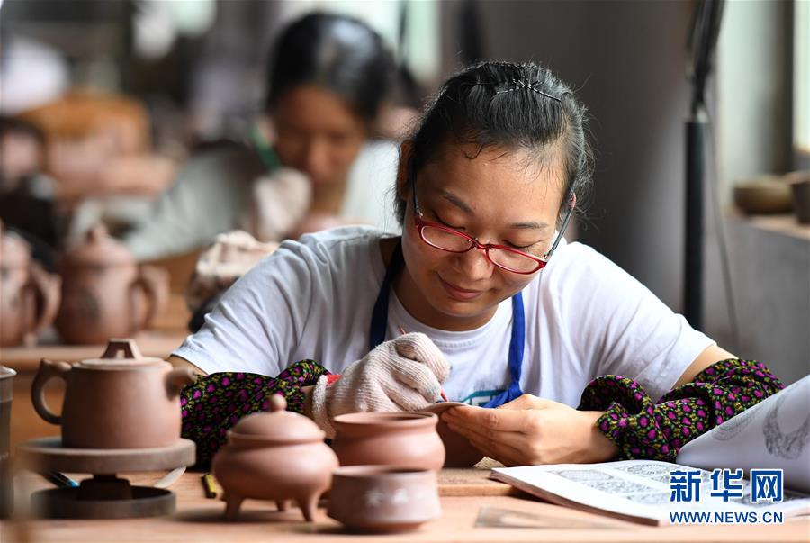 10月9日,欽州市一家廣西坭興陶生產企業的員工在制作坭興陶產品。 新華社記者 陸波岸 攝