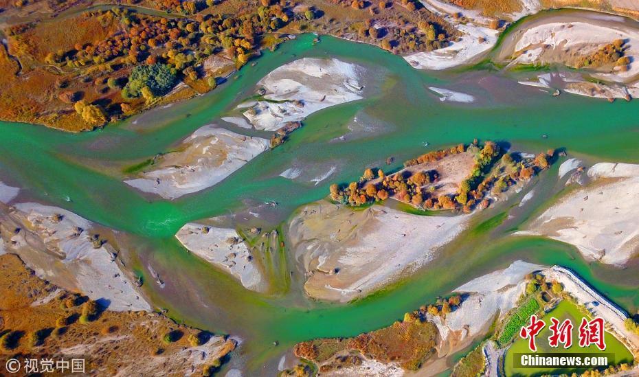 10月5日,新疆巴音郭楞,流過新疆和靜縣巴潤哈爾莫敦鎮的開都河秋景(無人機拍攝)。 圖片來源:視覺中國