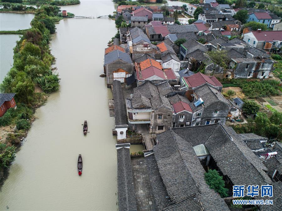10月10日,泉家潭村村民劃著小船經過沿河長廊(無人機拍攝)。經過改造提升后,沿河長廊和整潔的古村街巷成為當地美麗鄉村的景觀帶。  新華社記者 徐昱 攝